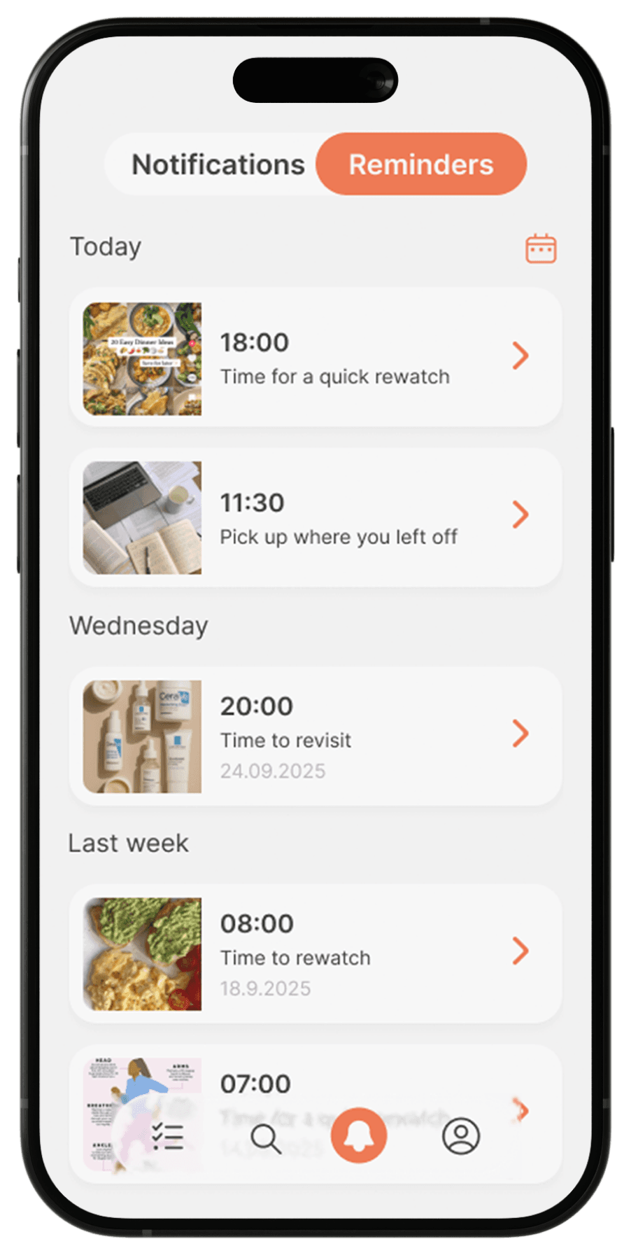 Customizable Reminders Allowing users to schedule specific times to be prompted with their saved content, ensuring it resurfaces exactly when they have the "headspace" to consume it