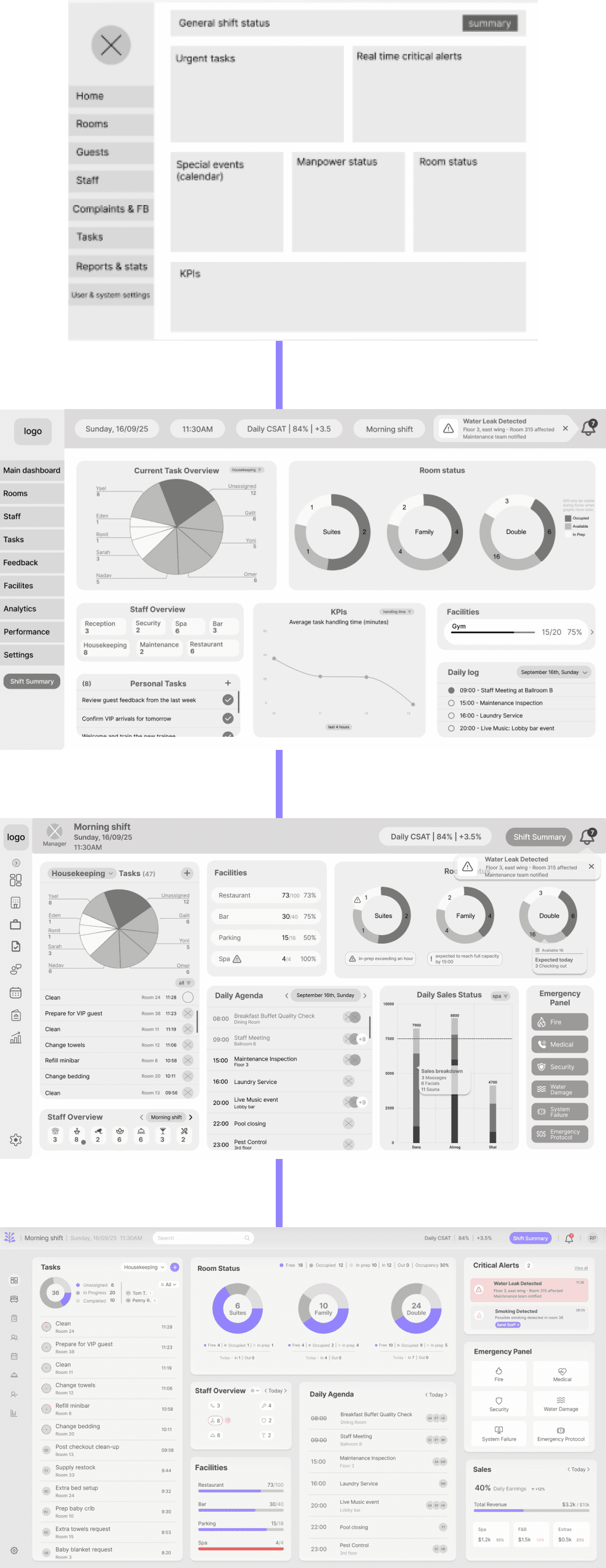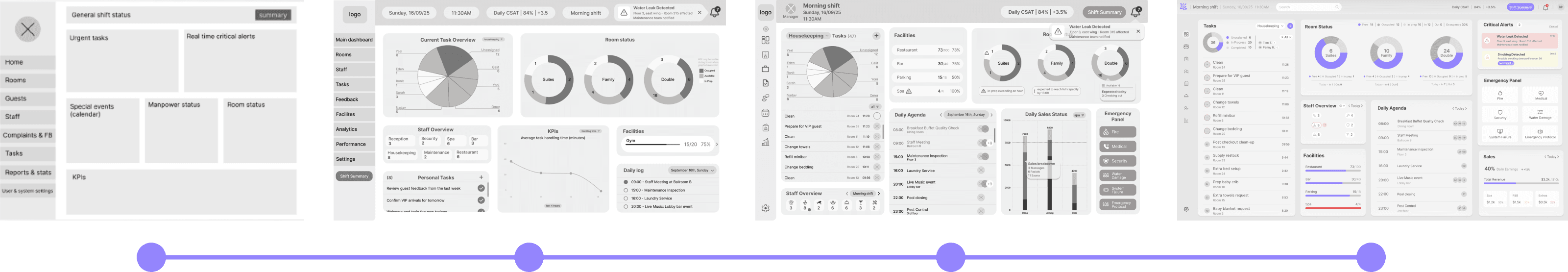 I used Claude throughout the UX process, for UX copy, content strategy, microcopy decisions, and pressure-testing design decisions. Research was conducted with Perplexity for fast, sourced exploration of hotel management systems and shift manager workflows. Data visualization and dashboard layout decisions were informed by reviewing real-world tools like Cloudbeds and ShiftNote.