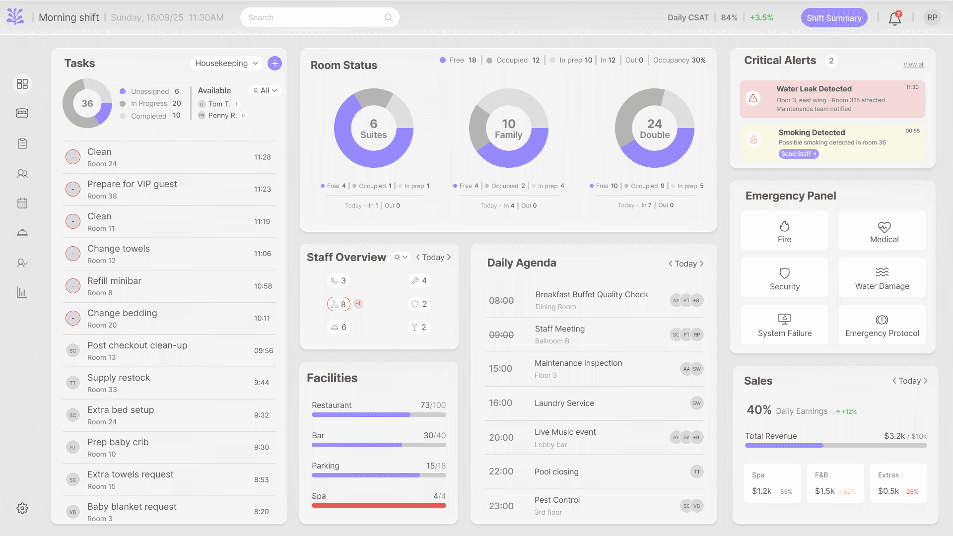 Real-time awareness - Alerts, room status, and staff availability are always visible without navigating away